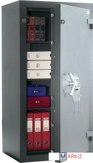 Это настоящий мини-банк, обладающий 3-м классом устойчивости ко взлому и трехсторонней десятиригельной усиленной системой запирания с защитой от выбивания и высверливания. Современные электронный и ключевой замки укреплены стальными вставками. Две внутренние полки, предусмотренные в данной модели и внушительный объем сейфа позволят не беспокоиться о дефиците места.